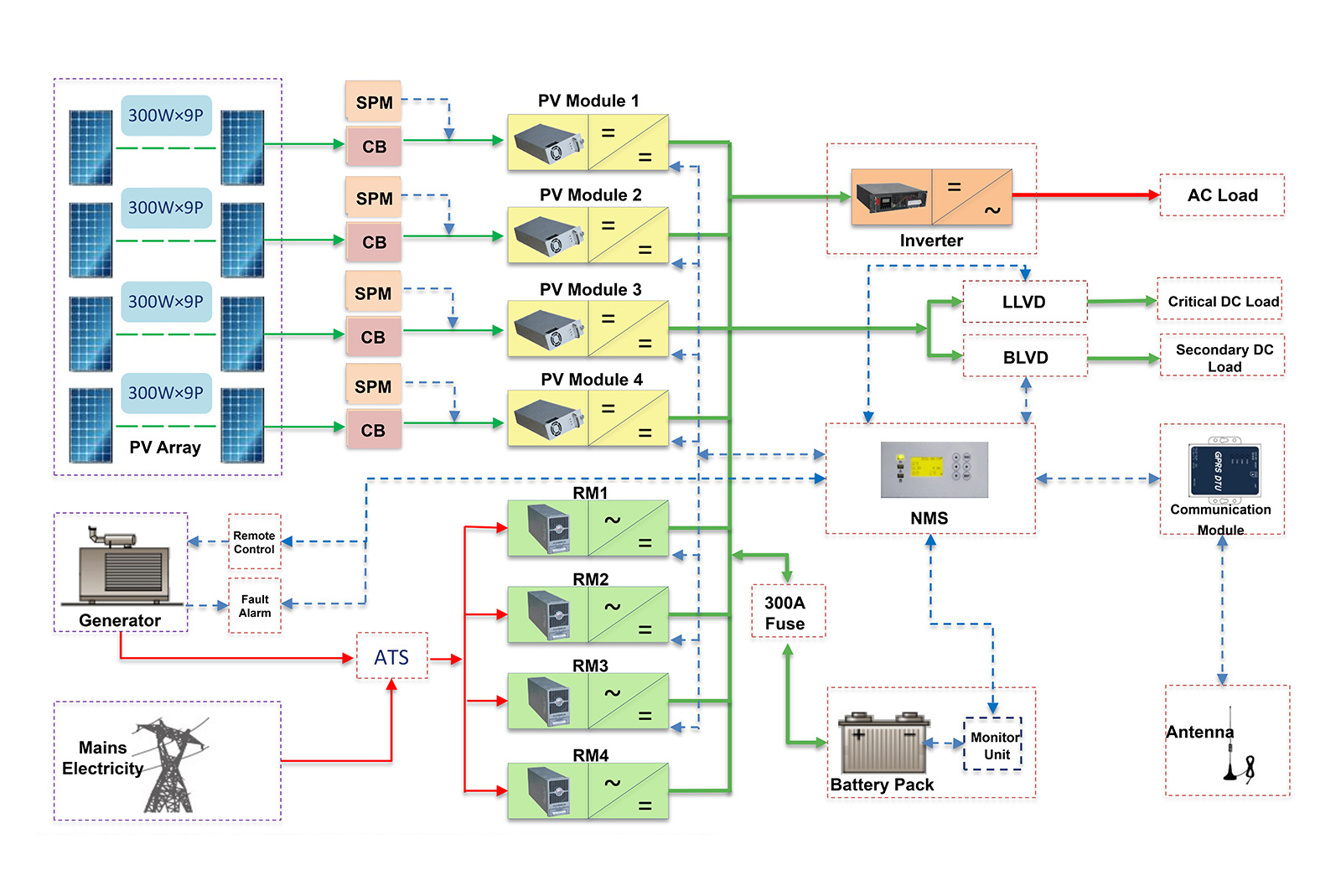 Our company has operated in the integrated power supply system field for many years. Leveraging advanced AC/DC integration technology and intelligent management platforms, we provide customers with practical power solutions. Our product range covers UPS power supplies and -48V communication power supplies, and we can customize power supply schemes according to different scenario requirements. For example, in off-grid outdoor scenarios, we utilize complementary power supply modes such as photovoltaic modules, energy storage systems, and diesel generators to provide stable electricity for various loads. Meanwhile, lightning protection and monitoring modules are configured to ensure the safe operation of the system. The topology diagram is as follows: